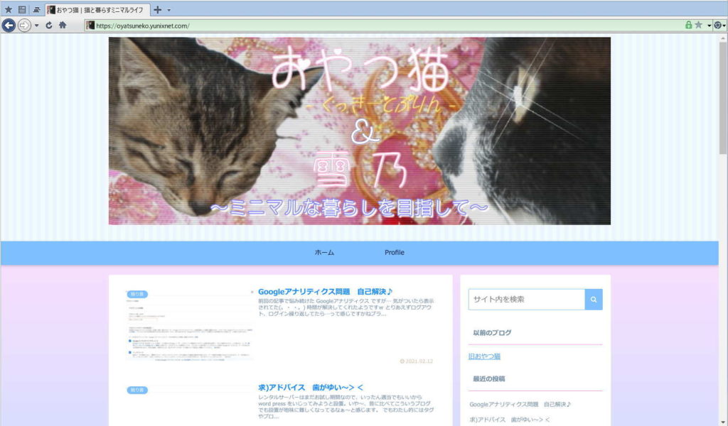 無事ブログお引っ越しです独り言 2021.02.15 2021.02.14独り言ameba blogで再開したブログですが…ドメインも取得できたのでこれからはこちらでのみ更新していきます♪まだまだ設定とかちゃんと出来てないところもたくさんありますがたまに見た目ががっつり崩れてても気にしないでくださいね(。・ ・。)裏で画面にらみつけて色々やってるときだと思うのでwやっぱり広告の出ないページは見た目もすっきりですね~(*´∇`*)まとまりのないブログですが、これからもよろしくお願いします
