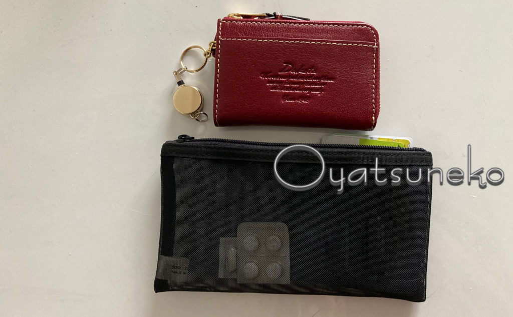 メッシュケースは『無印良品』のペンケースにお札、常備薬、出先によって必要なカード、保険証入れにしています。